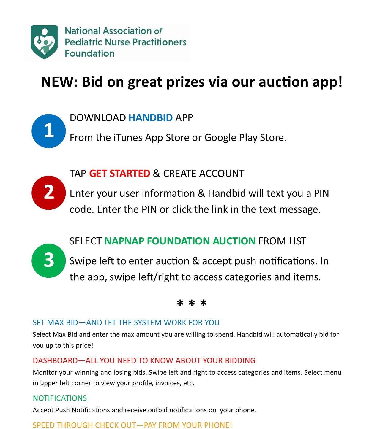 We are using the Handbid app again this year, so all NAPNAP members can participate regardless of whether you can join us in person. You can bid and win while at conference or in the comfort of your home! Items will be shipped to winning bidders not present at the conference.